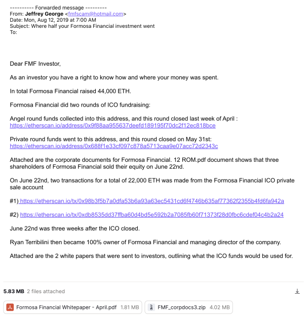 直到推出一年多后,寶島金融的投資者才最終了解他們的投資發生了什么。2019 年 8 月 12 日,寶島金融投資者收到一封匿名電子郵件,稱在 2018 年 ICO 后僅三周,寶島金融 ICO 私募錢包中就有 22,000 / 44,000 ETH 已經被投走。能證明這一點的各類內部文件,被附在該電子郵件中。