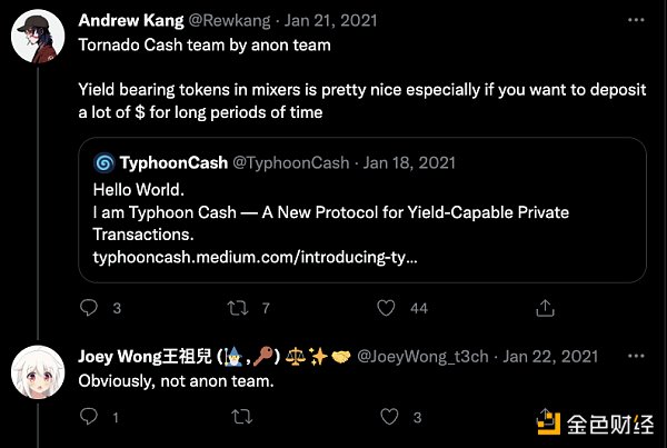 在秘銀現金(Mith Cash)崩潰和燒毀后不久,麻吉大哥再次帶著 Tornado Cash 分叉項目 Typhoon Cash 回來了。Typhoon 團隊聲稱擁有一支匿名團隊,但眾所周知,黃立成及其朋友們是 Typhoon 的幕后黑手。在發布時,很明顯開發方面草率。任何人都可以在匿名池中質押并保持匿名,但是為了獲得獎勵,必須在池中進行質押。這意味著為了獲得獎勵,您的獎勵存款將被人盯上(doxxed),從而使匿名硬幣的概念一文不值。在挖礦開始后的幾周內,該項目又被放棄,離開 Telegram 和 Discord 頻道的成員毀了它。