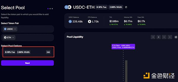 這里我們直接加入別人的池子即可,搜索結果排在第一的是 APR 最高的一個池子,可以看到這個池子的手續費是 0.1% ,價格區間大小是 2% 。
