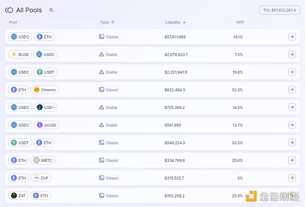 Syncswap的流動性總量為6761萬$,其中ETH-USDC Pool就占到了5761萬美金,占比84.5%。