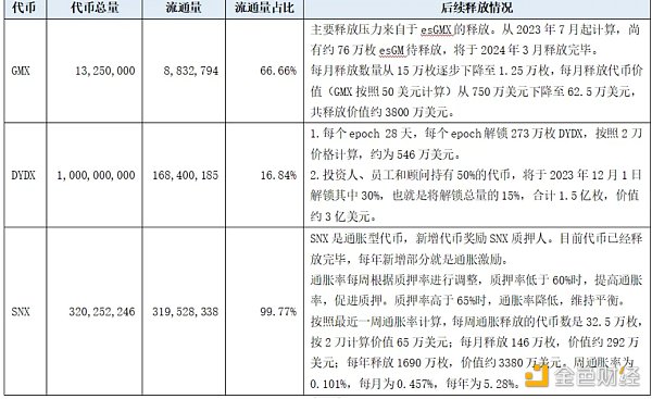 對比來看,GMX接下來兩個月的代幣釋放市值最大,半年后基本釋放完畢,后續拋壓最小。DYDX還有大量的拋壓,如果沒有妥善的方案解決鎖倉的代幣,會對市值的增長形成較大壓制。SNX屬于通脹型代幣,持續有新增代幣,但其前期代幣已經完全流通,需要消化新增部分,每年約5%。