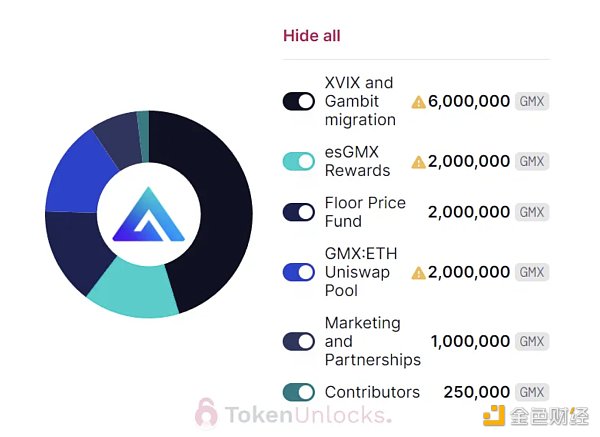 除了esGMX之外,貢獻者代幣是上線后兩年內線性釋放。GMX是2021年8月上線的,因此,貢獻者代幣還處在釋放中,不過額度較低,因此不再單獨分析。其他的代幣均已釋放。