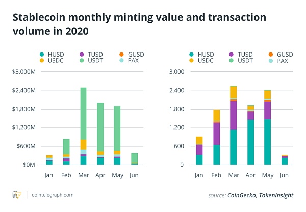 我們還研究了穩定貨幣的美元價值和交易活動的數據。3月份鑄幣活動達到頂峰,也是2020年迄今鑄幣價值最高的月份。