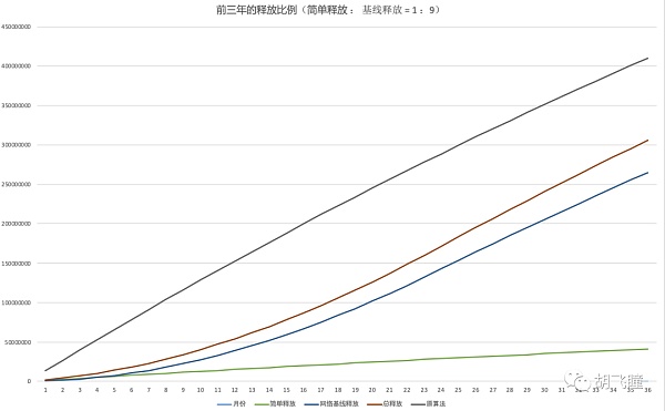 前面提到的是1:9 的比例。但是這個比例是很可能改變的。下面我們看一下按照1:1的比例的3年和10年的釋放圖: