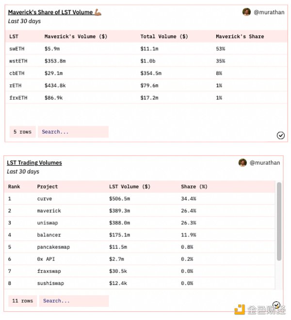最近30天,Maverick處理了超過50%的swETH交易量和35%的wstETH交易量,使其成為僅次于Curve的第二大高效用的LST交易AMM平臺。