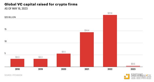加密貨幣在2022年暴跌,但加密風投仍然設法吸引了創紀錄的216億美元新資金。雖然ETH和BTC等資產在2023年呈大幅復蘇趨勢,但風投們今年并沒有從投資者那里看到多少進一步投資該行業的興趣。簡而言之,今年到目前為止,融資額直線下降,比去年下降了98%。