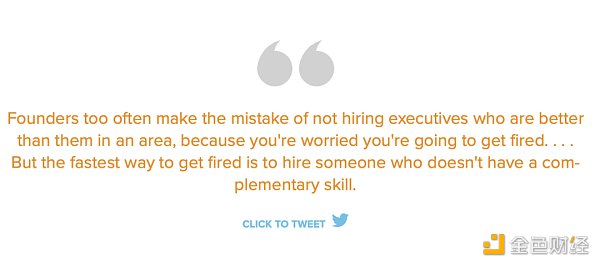 當你開始擴大規模、獲得真正的收入并開始建立領導團隊時,創始人們經常犯的一個錯誤是不雇傭在某個領域比自己更優秀的高管,因為擔心自己會被解雇。你擔心投資者會說,例如:“這個人在銷售方面比我更強,也許他們會解雇我,然后讓那個人接管。”但實際上,雇傭一個沒有互補技能的人,是最快被解雇的方。你想要的是在這些領域比你更出色的高管。