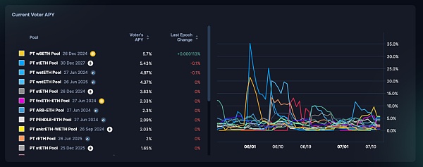 Voter APY 來源:veP 持有者可以通過投票將 Pendle 代幣模型中的流動性獎勵分配引導至不同的池子中,以此來激勵投票池中的流動性。