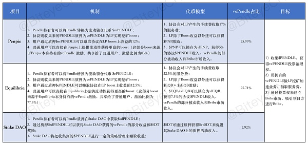 目前 Pendle 協議采取的是 veToken 和 Gauge 投票模式進行流動性挖礦激勵,所以圍繞著 vePENDLE 的投票權治理,有多個項目方通過類似 Convex 的思路來爭取 vePENDLE 的投票權來引導 Pendle 的流動性激勵,如下所示: