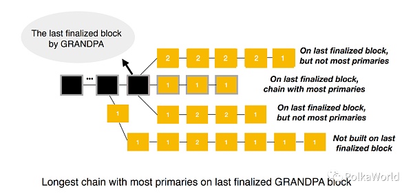 帶著 BABE 和 GRANDPA 混合機制,波卡的分叉選擇變得清晰起來。BABE 一定要建立在 GRANDPA 最終確定的鏈上。當在最終確定之后有分叉時,BABE 通過構建具有最主要區塊的鏈來提供概率最終性。