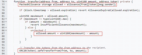 當通過了簽名校驗后,會調用_updateApproval函數更新授權值,這也就意味著你的權限發生了轉移。此時,被授權方便可以調用transferfrom函數將代幣轉移到制定地址,如下圖代碼。