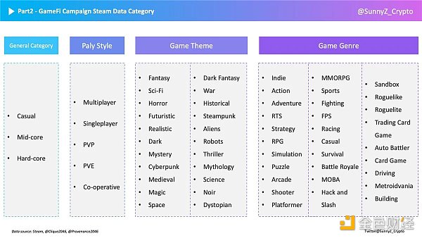 除了常規的活躍度指標、購買力指標和影響力指標外,針對此次 GameFi 活動,新增了 Steam 中有關玩家行為偏好的數據,具體如下: