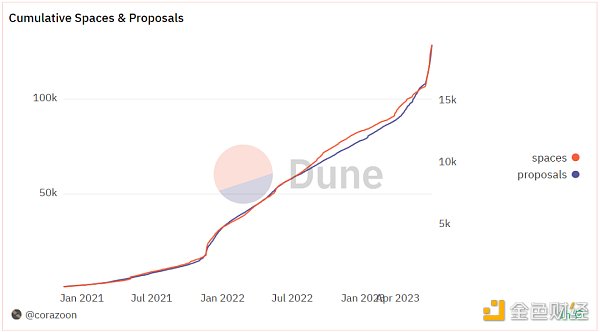大多數Space只允許限定的作者提交提案,因此提案數量與活躍空間數量的變化規律相似。2021 年增長緩慢,2022 年保持穩定,2023 年第二季度出現明顯增長。