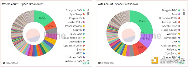 從2021年初開始,每月新建和活躍的Space開始緩慢增加,并在11月開始迅速增長,并2022年和2023年上半年依舊維持在較高水平,同時每月活躍的投票者和投票數都在持續增加。2023Q2以來投票數和新增space的激增可能有部分源于投票礦工,將在后文展開討論。