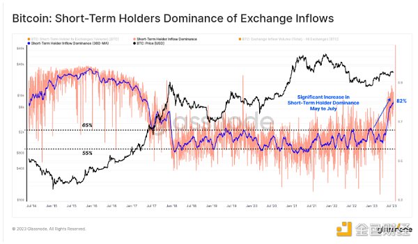 短期持有者在交易平臺流入中的主導地位已飆升至 82%,目前大大高于過去五年的長期范圍(通常為 55% 至 65%)。由此,我們可以證明近期的大部分交易活動都是由 2023 年市場中活躍的巨鯨驅動的(因此被歸類為 STH)。
