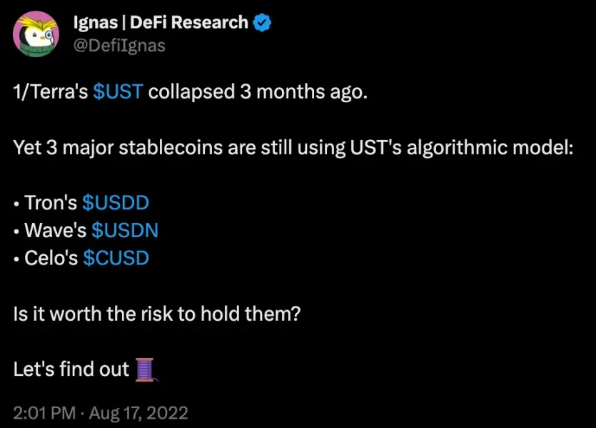 例如,就在一年前,我寫了篇關于 USDD、USDN 和 CUSD 算法穩定幣的文章。幾個月后,USDN 脫錨并重新命名為另一個 VOLATILE 代幣。