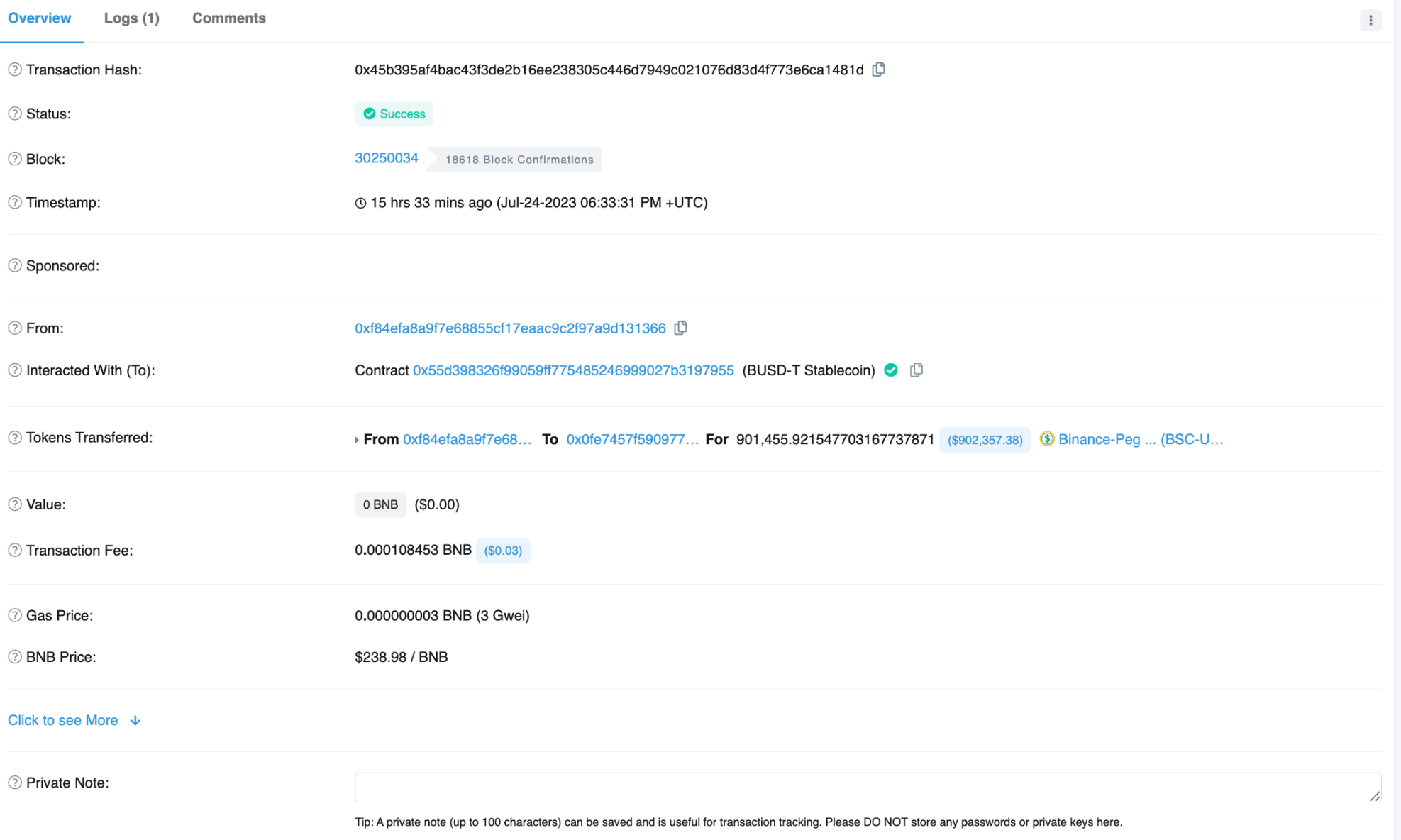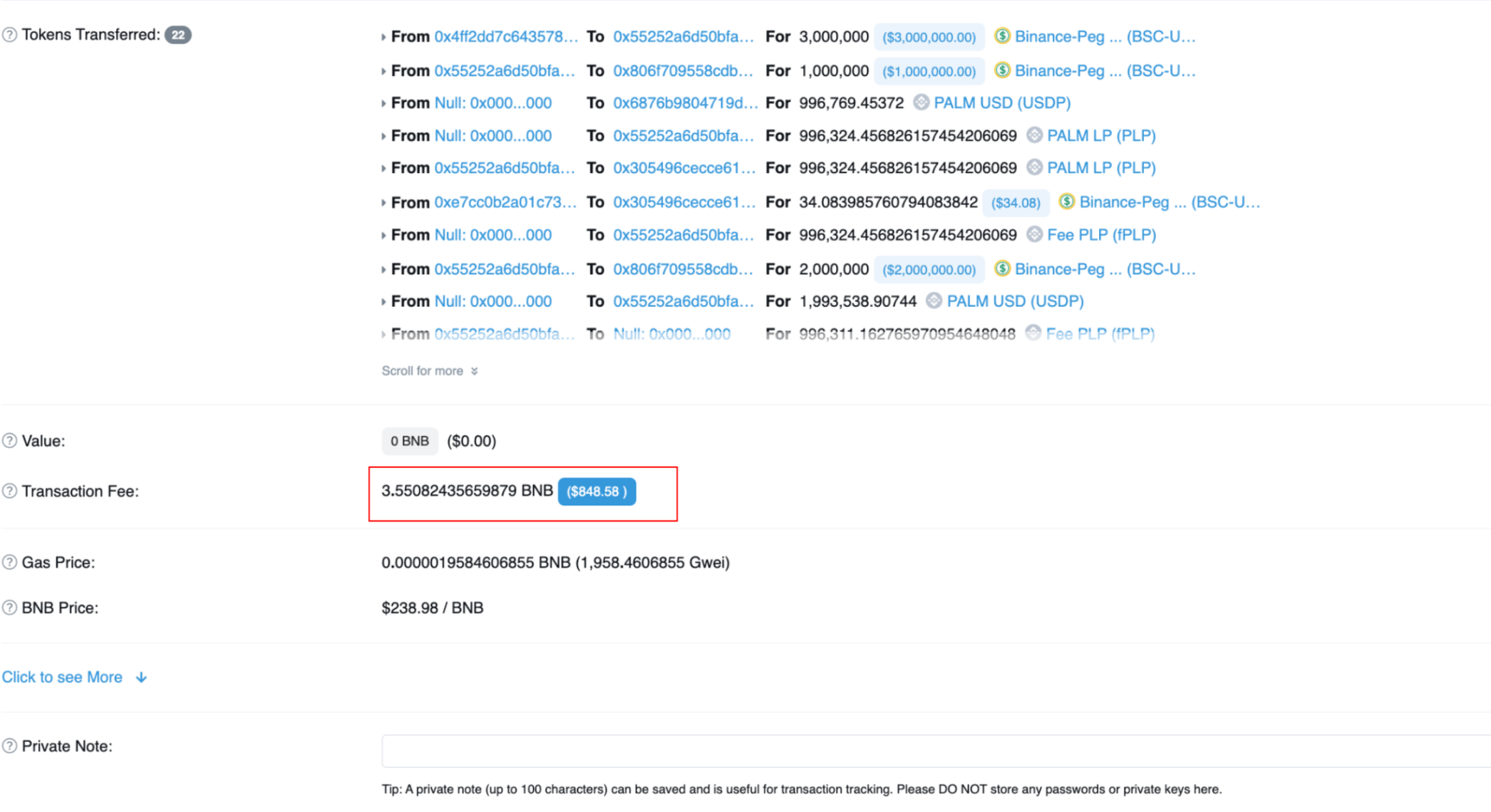 圖片:成功交易。來源:Bscscan由此可見,原始攻擊未能成功完成,是因為攻擊者沒有額外的 0.4 BNB 來支付交易費用。