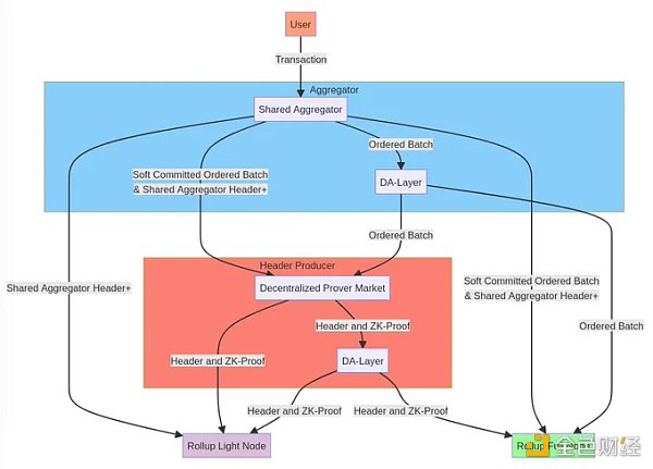而在Batch發到DA層之前,共享聚合器SA可以先將Batch+ SA Header廣播給全節點和Prover,將SA Header廣播給輕節點,只是此時未上DA層的Batch還不穩定,隨時可能被替換。