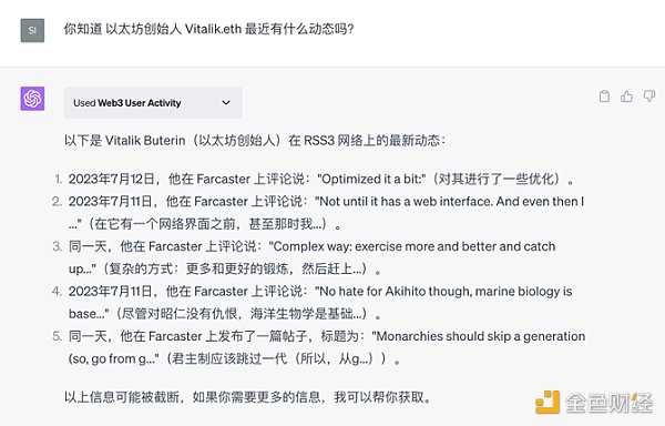 比如通過輸入V神的地址就可以用 Web3 User Activity 獲取到 Vitalik 在 Web3 中的行為,追蹤到他在各平臺上的動態,如在 Farcaster 社交平臺上的貼文。