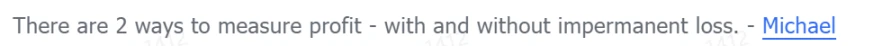 按照最直接的想法,定義損益很簡單,將兩個 Token 的價值折算成 U 或是其中任意一個(X_token 亦或 Y_token),二維轉一維,然后對比 A 調整前后的總價值。這也是 Michael 提到的 ‘With Impermanent Loss’。