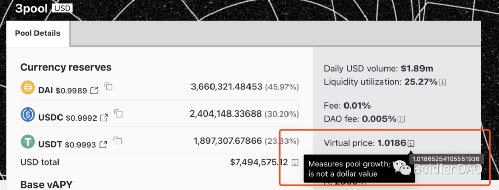 這就是 D 值,D 值是 Curve 曲線公式在 A 之外的另一核心參數。我們在 Curve 官網每個池子里看到的 Virtual Price 即為根據 D 值計算得出。