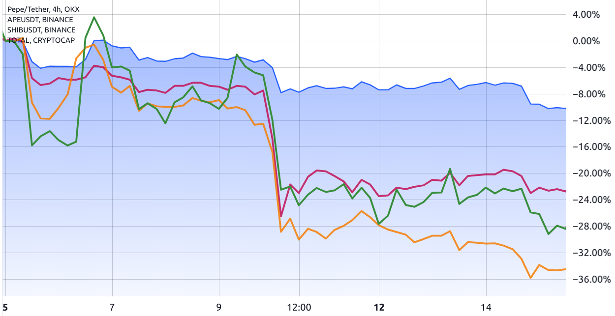 加密貨幣總市值(藍色)與 PEPE/USDT(綠色)、SHIB/USDT(紅色)、APE/USDT(橙色),2023 年 8 月。來源:TradingView
