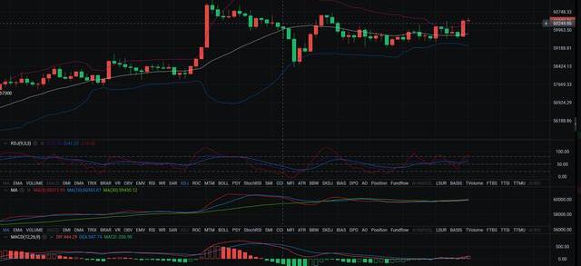 BTC昨晚在60000一線震蕩整理,上攻之后必然會迎來整理回調,行情也是會重新回到震蕩中。四小時級別BOLL呈張口姿態,K線運行在BOLL中上軌之間,MACD快慢線在零軸上方有形成死叉跡象,KDJ三線金叉向上發散,短期內上方壓力依舊比較大,日內操作上高拋低吸即可。59000附近做多,58600補倉,58800均價,目標看60000-60500,統一防守58300。60400附近做空,60800補倉,60600均價,目標59500-59000,統一防守61100。