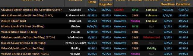 美國在去年10月正式允許推出比特幣期貨ETF、并在今年6月批準首檔杠桿的比特幣期貨ETF上市,但對于比特幣現貨ETF仍遲遲不放行。截至目前,包括貝萊德、富達、VanEck、Invesco、Valkyrie、WisdomTree、Bitwise等基金管理公司都提交了比特幣現貨ETF的申請,而灰度正與SEC展開法律戰,尋求將旗下比特幣信托基金轉型成比特幣現貨ETF。