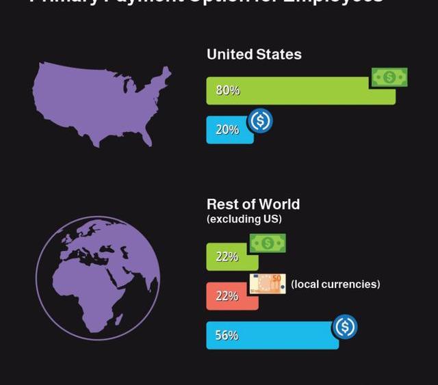 一般情況下,80%美國人都會使用美元進行薪酬結算。而除去美國以外的其他國家,更喜歡用USDC等穩定幣來進行結算。
