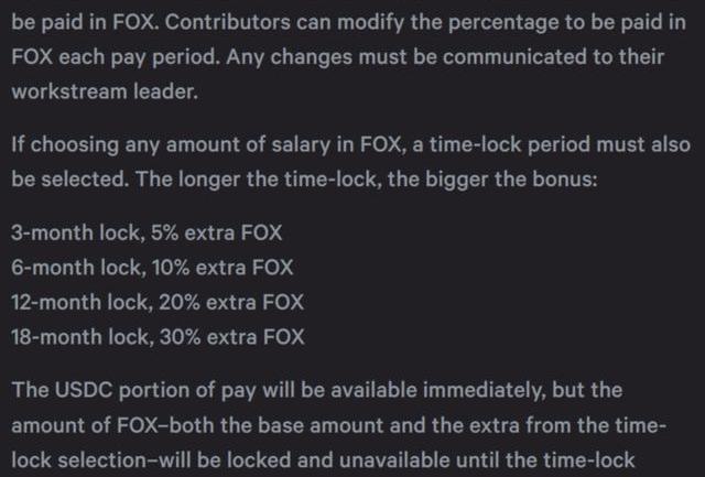ShapeShift將薪酬分為2個部分發放:USDC+FOX。貢獻者可以在其中自行選擇兩者的百分比,當然了100%&0%的組合都可以。原生代幣另外添加了一個鎖定期,鎖定時間越久,bouns到手的也就越多。