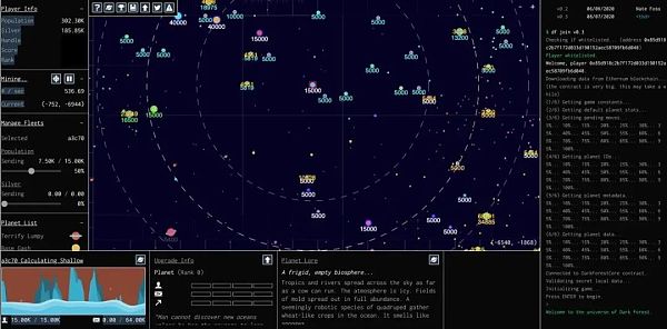 Dark Forest 采用了全鏈上技術和 zk-SNARK 來實現其獨特的游戲體驗,即全部游戲規則和邏輯都以智能合約的形式部署在區塊鏈上。這意味著玩家和宇宙的狀態會在每一次交互后實時更新到鏈上。