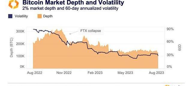 一些專家指出,流動性下降是近期波動性增加的原因。根據Kaiko近期的市場評估,比特幣訂單深度下降2%反映了波動性的下降。做市商可能已經調整了算法以適應當前的市場狀況。