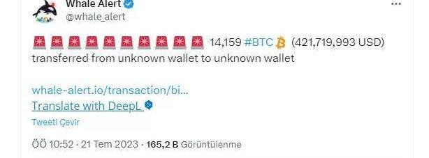 來自鯨魚研究平臺WhaleAlert的新數據顯示,一位高凈值投資者以一種引人注目的方式將價值4.217億美元的14,159個比特幣(BTC)從一個未知錢包轉移到另一個錢包。