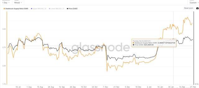 與此同時,衡量比特幣市值與穩定幣市值之比的另一個關鍵穩定幣指標——穩定幣供給比一直在上升,表明穩定幣的購買力相對于BTC有所下降。