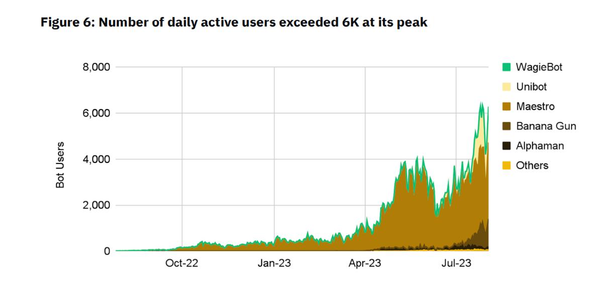 Maestro保持領先,每日活躍用戶約為2000-3000人。Unibot正在趕上,近幾周該差距顯著縮小;每日活躍用戶在7月的兩周內從約400激增至峰值時的1700人。