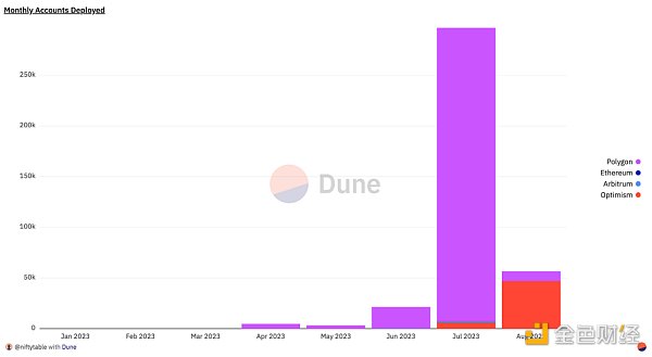 同樣的,隨著CyberConnect在L2上發布后,本周Optimism的ERC-4337使用率大幅上升。8月份前四天執行的UserOps數量就是整個7月份的4倍多。