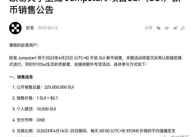 OKX將于2023年4月23日開啟SUI新幣銷售。活動將采用最新的「認購+抽簽」的方式銷售SUI代幣,銷售價格為每枚代幣0.1美元。支付幣種為OKB認購時間為2023年4月23日10:00至4月24日10:00。流程包括持倉統計,新幣認購,抽簽與發放。在OKX完成KYC2驗證等條件即可參與活動。