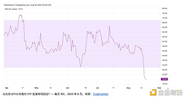 經過鯨魚長達一個月的拋售狂潮后,以太坊現在似乎已經滑入超賣區域。根據相對強弱指數數據,以太坊 8 月 18 日每日RSI收于 14。 簡單來說,這意味著過去兩周 ETH 每日價格變動的 86% 呈下降趨勢。
