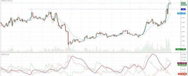 EOSUSD4小時圖,來源:Tradingview4小時圖上的日均線已升至41水平上方,這表明短期趨勢強勁。+DI在-DI上方,而20-EMA在上升,這表明多頭具有優勢。