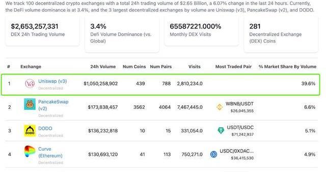 全生態第二大DEX,交易量僅次于UniswapV3,目前TVL3.05B,24Hvolume340.4M,BSC生態第一大DEX,市場份額80%以上;
