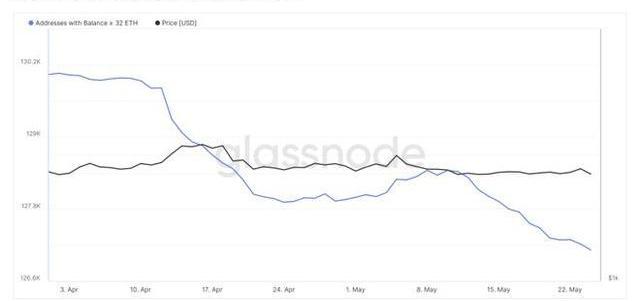 這種拋售壓力似乎是由該領域的較大參與者推動的,最近幾天包含>32ETH的地址數量顯著下降。