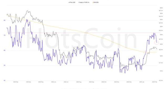 利潤中的供給比率在1月出現了大幅的上漲,最高值一度恢復到2022年4月以來的最高水平,目前仍然保持在365天移動平均線上方。2月后開始出現了明顯的回調趨勢,走勢幾乎和BTC價格同步,很可能和近期美國主力資金的離場相關,美國10年期國債近幾日也是大幅上漲,短期內吸走了不少金融市場的資金。