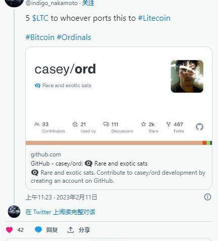 在假名Twitter用戶IndigoNakamoto向任何可以將Ordinals協議“移植”到萊特幣網絡的人提供5LTC之后,Ordinals首次登陸萊特幣。