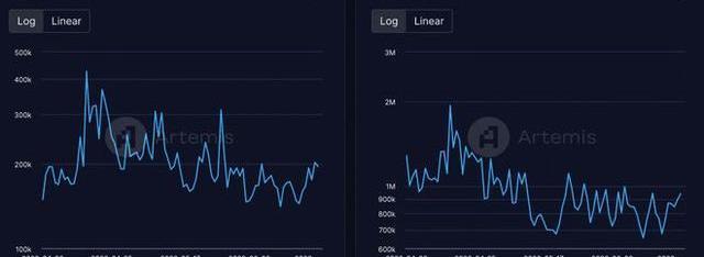 從活躍度來看,Arbitrum的日活躍地址明顯減少。根據Artemis的數據,上個月,Arbitrum上的活躍地址數量從311,000個下降至119,000個。因此,協議上發生的交易數量也大幅下降。