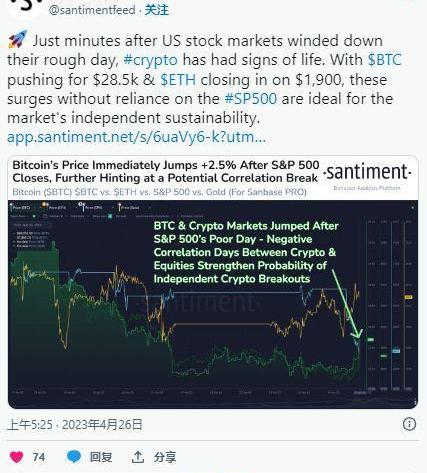 來自加密分析公司Santiment的數據表明,比特幣與標準普爾500指數之間的相關性可能正在減弱,因為比特幣是銀行業危機中避風港的說法開始再次升溫。
