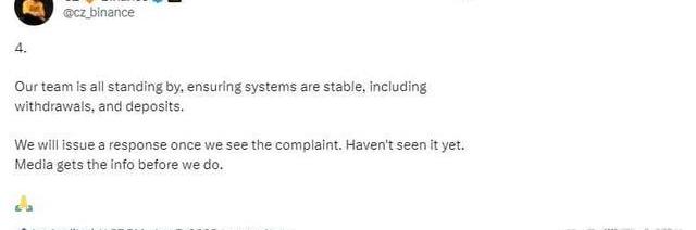 “我們的團隊正全力做好準備,確保系統穩定,包括取款和存款。一旦看到訴狀,我們將立即發出回應。目前還沒看到,媒體在我們做之前獲取了信息。”