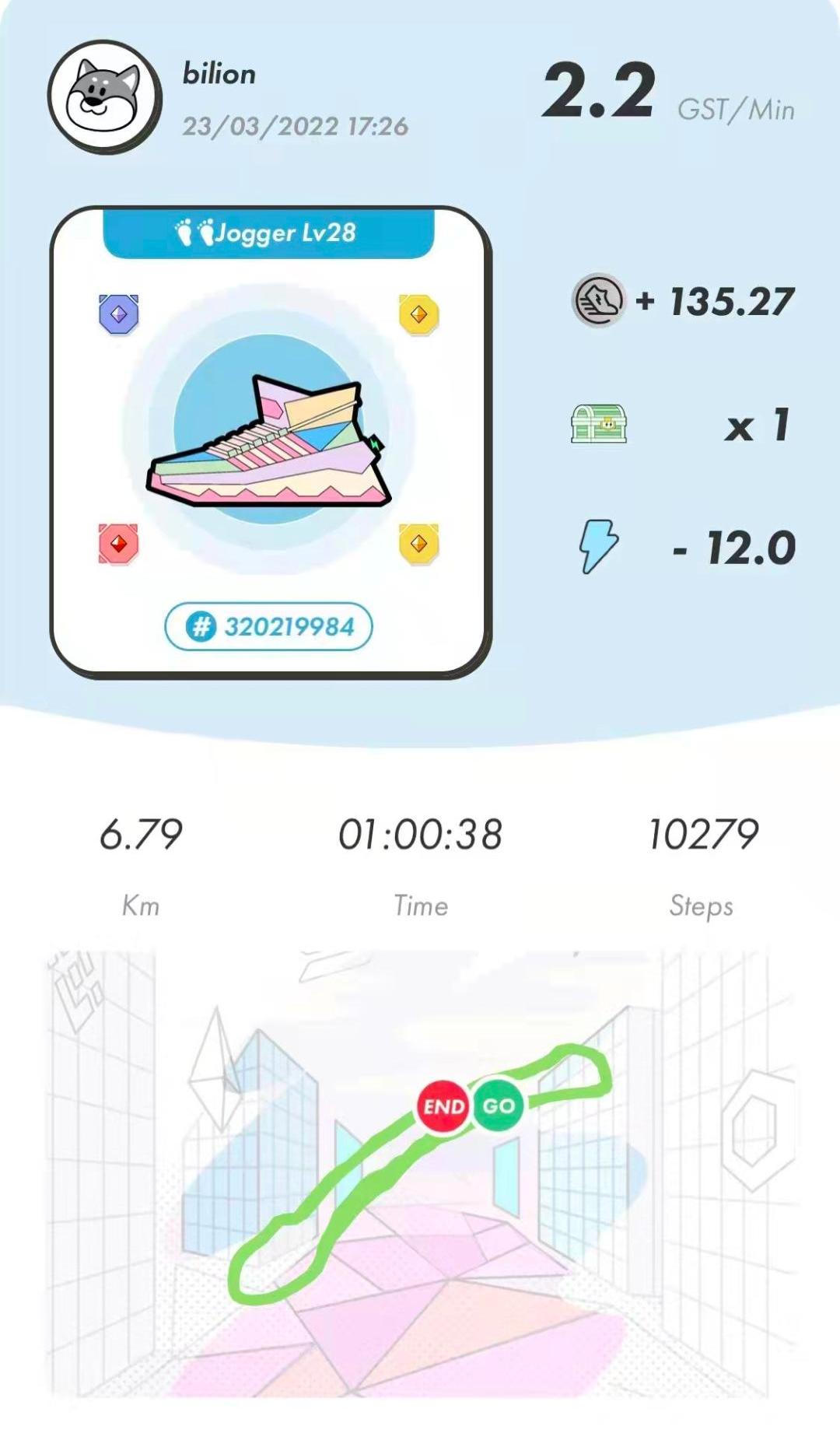 Gino通過“鞋生鞋”賣出的鞋子已經不計其數。隨著個人賬號慢慢升級,她一天能運動1個小時,收入每天已經達到200GST左右,在3月上旬時相當于600美金。