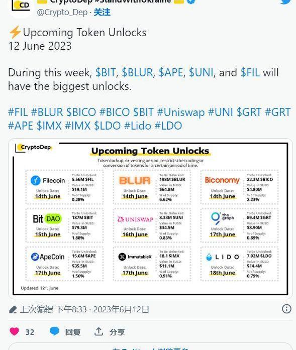 6月16日,UNISWAP將釋放833萬個代幣,價值3450萬美元,占總供應量的0.83%。盡管與其他代幣相比解鎖量相對較小,但由于其在去中心化金融生態系統中的突出地位,UNISWAP的解鎖量值得關注。