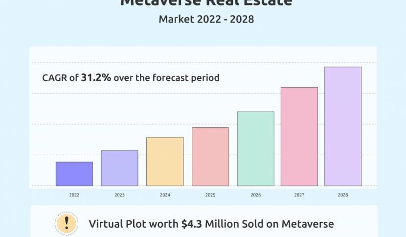 元宇宙房地產是將虛擬世界中的土地分成很多部分出售和交易,并在土地上創造各種用例。簡單來說,元宇宙中的每塊地就如像素格子一樣,然而它們不僅僅是數字圖像,而是虛擬現實平臺中的可編程空間,人們可以在其中社交、玩游戲、銷售NFT、參加會議、參加虛擬音樂會,以及進行無數其他虛擬活動。隨著元宇宙的崛起,數字房地產預計也將增長和擴張,預計其行業價值在2022年至2028年期間的復合年增長率為31.2%。