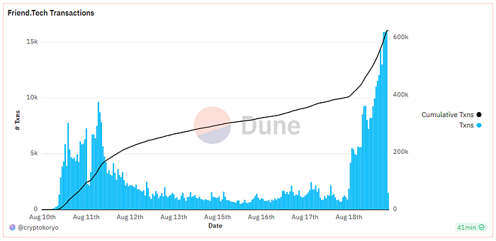 Dune數據面板顯示,Friend.tech當前累計交易筆數達到約62.6萬,應答約4.4萬個,相當于約1.6萬個。8月18日,在Friend.tech首次激活每周五積分空投后,交易雙方數量都出現增長。